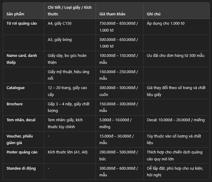 Để giúp khách hàng có cái nhìn tổng quan về chi phí, dưới đây là bảng giá tham khảo cho một số sản phẩm in nhanh tại Quận 8. Lưu ý: Giá có thể thay đổi tùy thuộc vào số lượng, chất liệu, kích thước và yêu cầu thiết kế cụ thể.